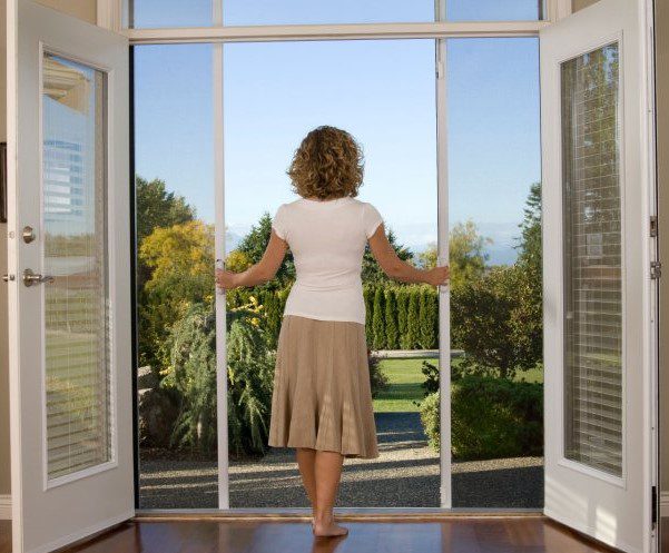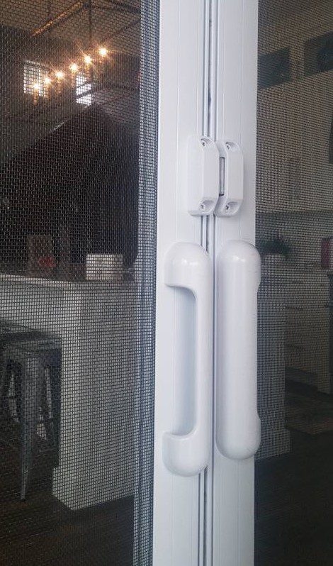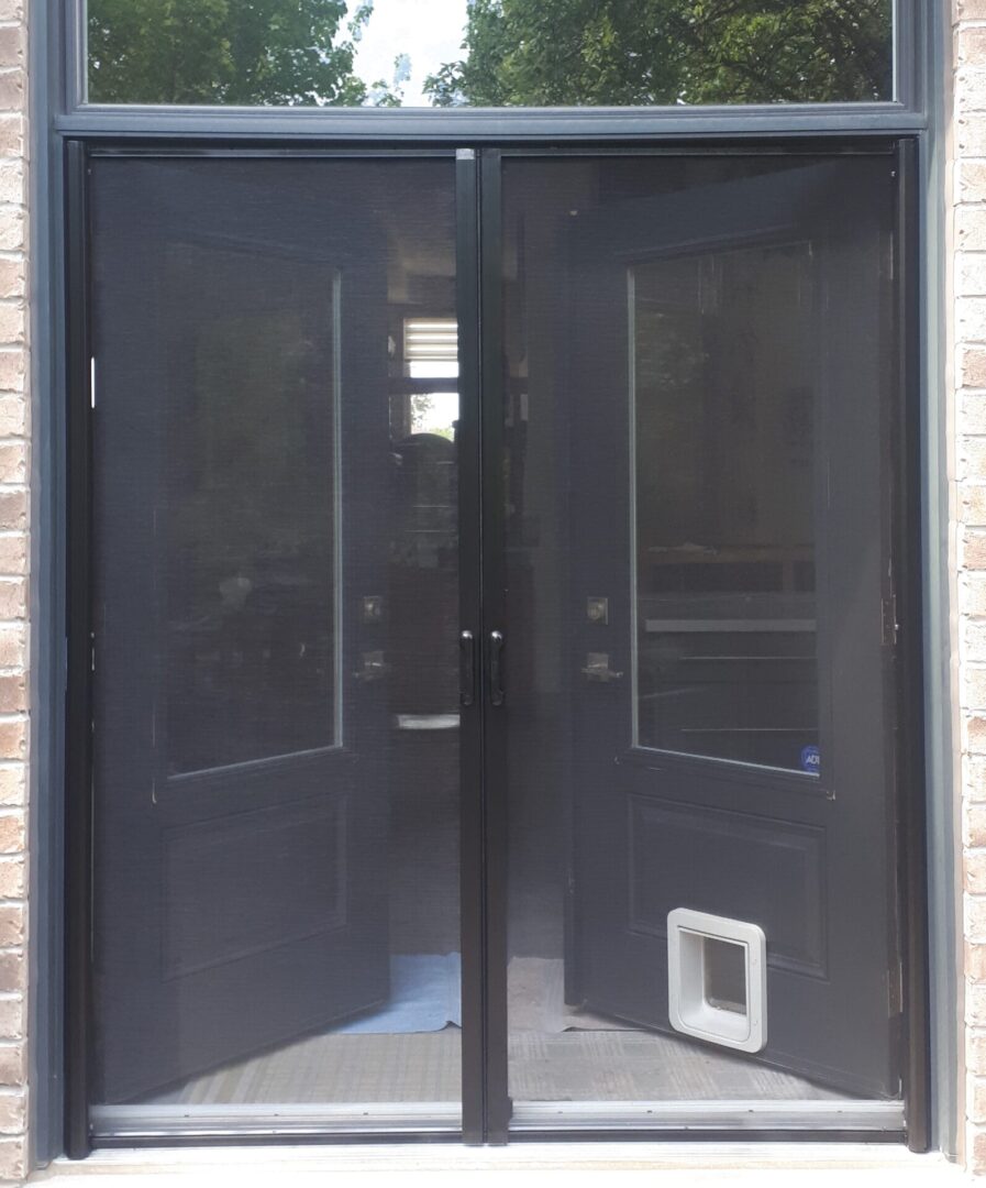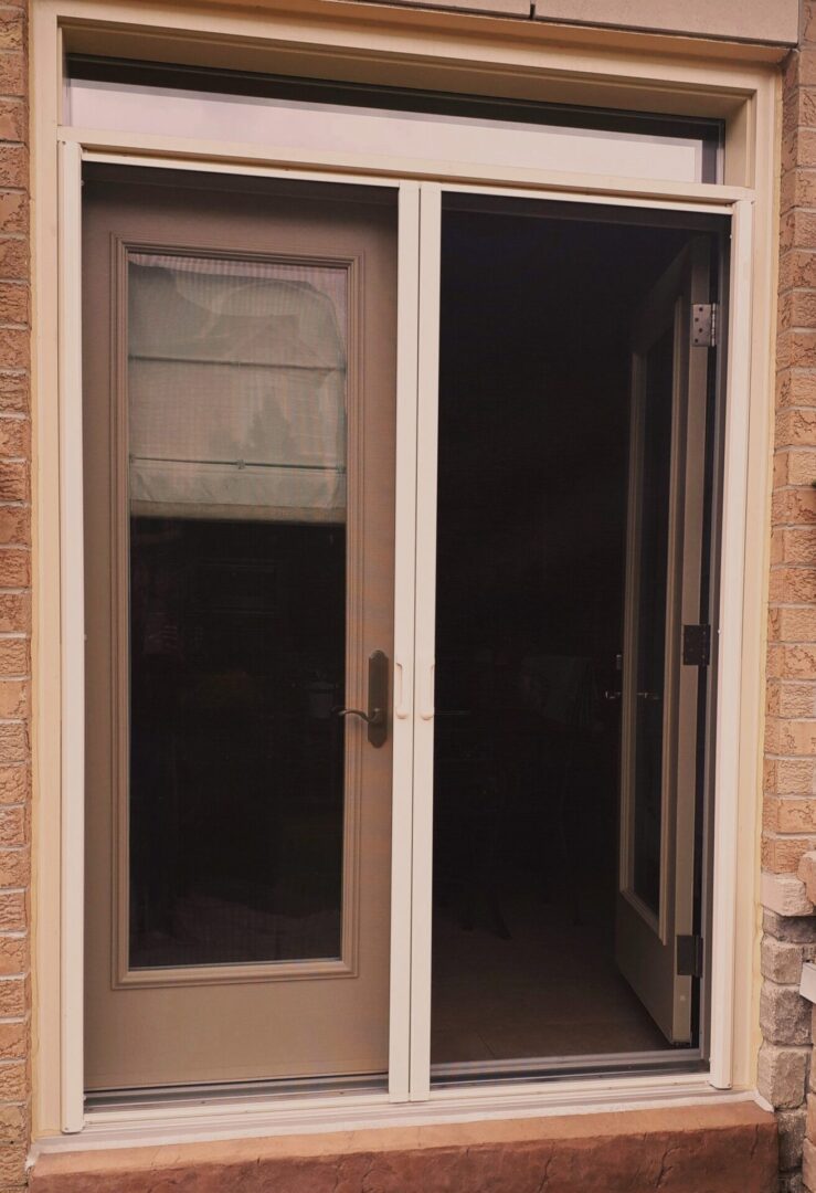 One retractable screen is mounted on both left and right sides of the opening which meet in the middle of the doorway when closed. The less frequently used side's screen is held in place with 2 special slide bolt pins, then the opposite side's screen slide bar is pulled over to the middle where it automatically latches the super magnet system. To open one side, pull the handle slightly towards you, then guide the slide bar back towards the housing to roll up the screen mesh into its protective housing. You can leave the other screen in place when used frequently such as in wam weather, or opt to disengage the slide bolt pins each time to roll it back up into the other housing. In wintertime and when screen is not used everyday, it is recommended that both screens be rolled up out of the way to keep them clean and protected from possible damage to screen mesh.